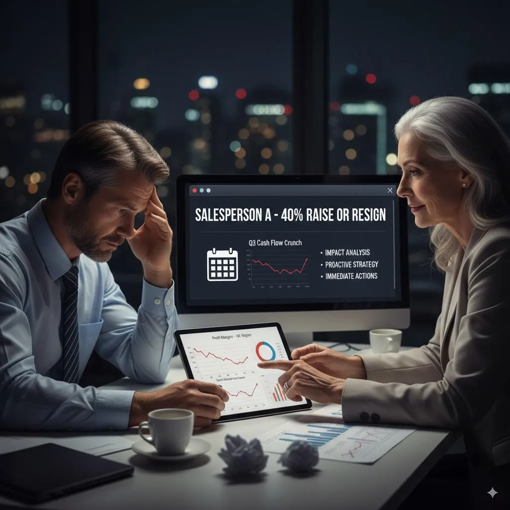 Your dashboard shows profit margins dropping in the northeast region. Your cash flow forecast predicts a crunch in Q3. Your best salesperson wants a 40% raise or they're walking.